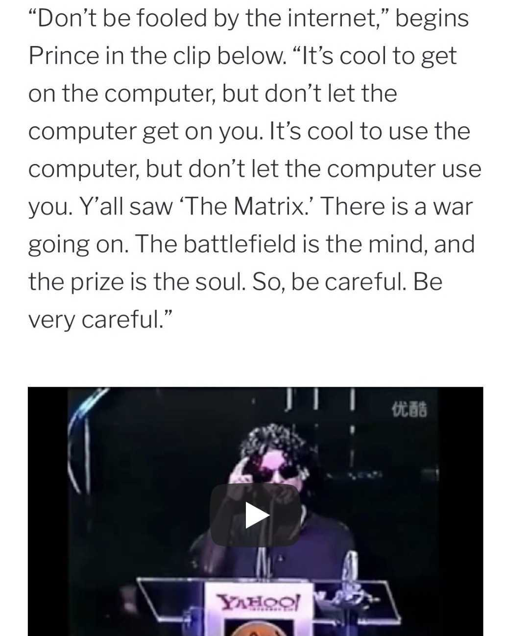 I certainly understand people are not ready to quit billionaire-owned social media en masse, and you should use whatever platforms suit your life and needs. Use what works for you! But I do encourage you to be wary. Guard your mind; be intentional about how you use your time and your computer; remember that there's so much more to life than the internet. I'll let Prince sum it up:
