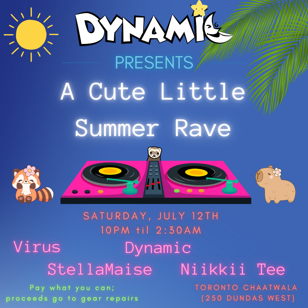 Cute Little Summer Rave - Saturday, July 12th at Toronto Chaatwala [250 Dundas West]: Very excited to be hosting a cute little summer rave at our beloved Toronto Chaatwala! I'll be spinning alongside some of my fave DJs in Toronto - Stella Maise, Niikkii Tee, and the legendary DJ Virus! Event is pay what you can, as usual for this series, but the proceeds this time (if any) will go towards gear repair. I lend out my gear for free to a lot of protests, community events, and raves; I like doing that and will continue doing it, but I have spent almost a thousand bucks on gear repairs and replacements so far this year and I gotta feed a kid too lol. So rather than charge for rentals, I'm doing this instead. :)