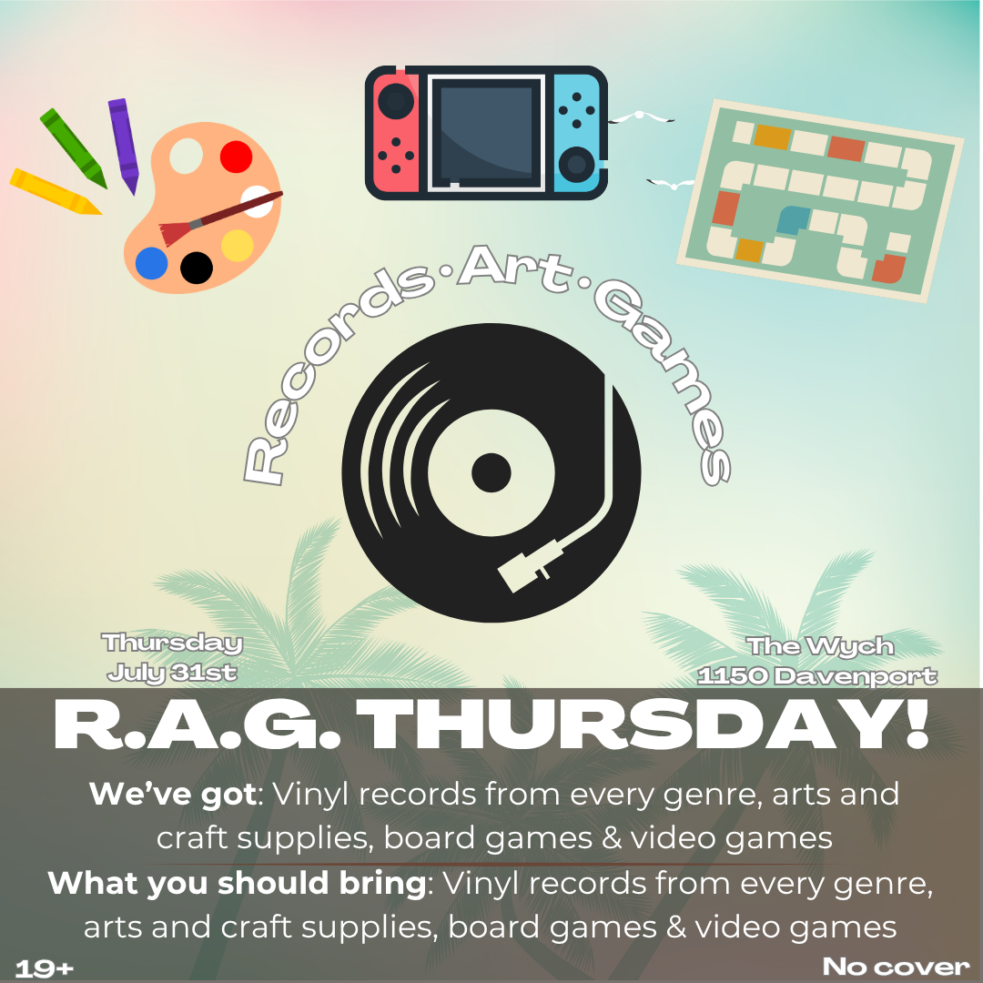 R.A.G. Volume 6 - Thursday, July 31st 8PM at The Wych: Join me and Gobs for our monthly hangout at The Wych, which now has patios open for the summer! Bring your own records, art supplies, and games, or use ours - we'll have plenty of each! It's a cool summer evening with friends and tunes and fun!
